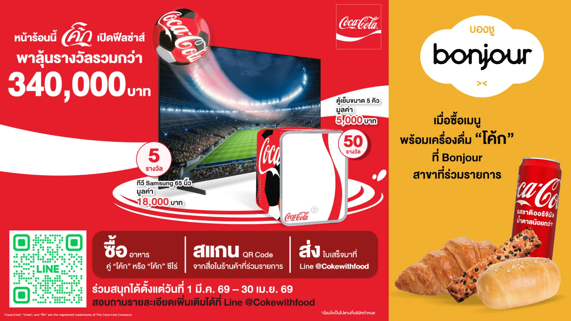Coca-Cola beverages are now available at all Bonjour branches nationwide, including Coca-Cola Original Taste, Coca-Cola Zero Sugar, Sprite, Fanta Strawberry, Schweppes Manao Soda, Minute Maid Pulpy, and Namthip Drinking Water. To celebrate the summer season, a special promotion under the Coca-Cola campaign invites customers to win exciting prizes with a total value of over THB 340,000. Customers who purchase a Bonjour menu item paired with Coca-Cola Original Taste or Coca-Cola Zero Sugar at participating Bonjour branches from now until 30 April 2026 will have the chance to win prizes.